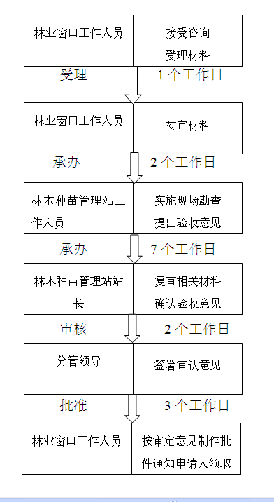 1、按照标准查验申请材料; 2、对申请材料齐全、符合形成审查要求,或者申请材料可以当场更正并符合要求的,即时受理,填写《种子生产许可申请书》; 3、申请材料不齐全的或者不符合审查要求的,当场或在3个工作日内一次性告知申请人补正申请材料; 4、将申请材料整理,签署意见后于时限内转交种子生产审核人员办公室。 |
