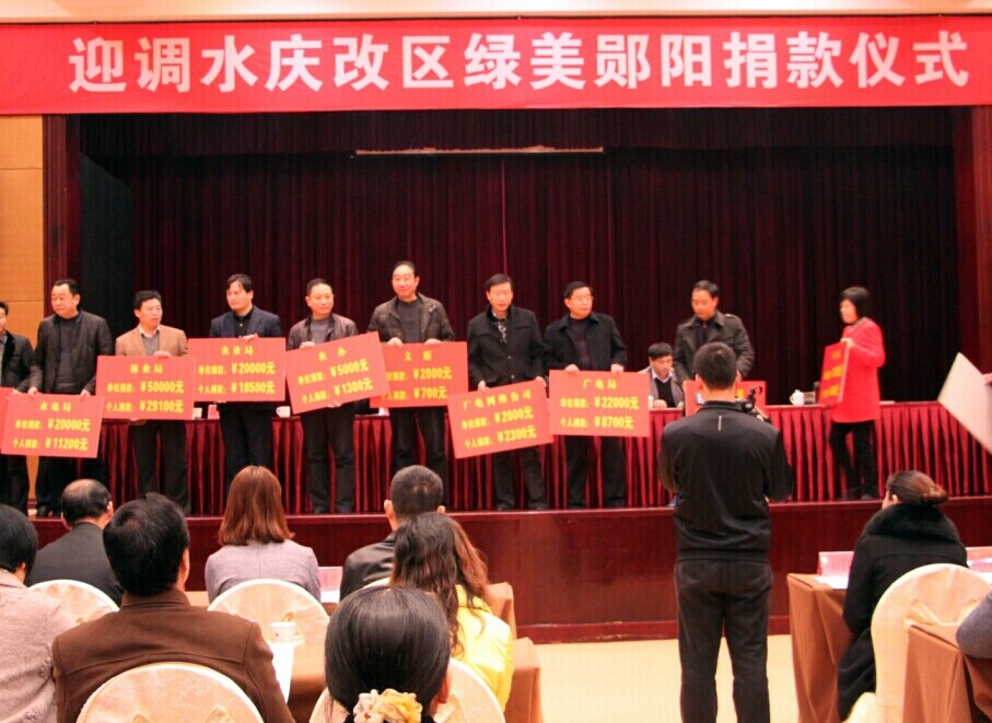 仪式上,邹龙权宣读了《迎调水、庆改区"绿美郧阳"行动方案》。随后,县内外企业及机关事业单位代表进行了现场捐款,部分企业以荒山披绿、城边植绿见缝插绿的形式积极参与活动,全县各界团结一心,用自己的实际行动支持"绿美郧阳"建设。现场共捐现金360万元,捐绿地价值160万元,捐苗木价值50万元。